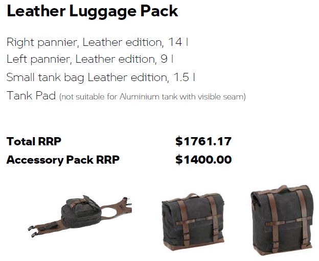 Leather Luggage Pack, Right pannier, Leather edition, 14 l, Left pannier, Leather edition, 9 l Small tank bag Leather edition, 1.5 l Tank Pad (not suitable for Aluminium tank with visible seam)